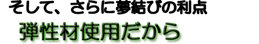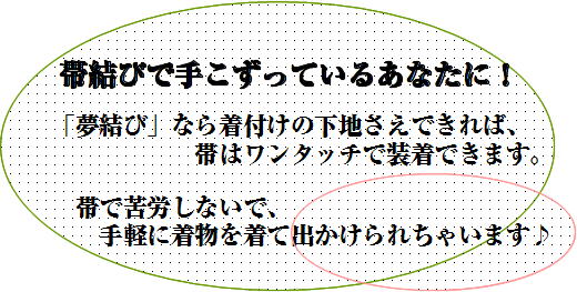 やっとの思いで作り上げたのが、この弾性材使用の「夢結び」なのです。もともと、着物を着る方のためになんとかして楽に締められる帯を作りたいとの一念で考案したものでございます。ぜひ、一度お試し頂ければ幸いです。