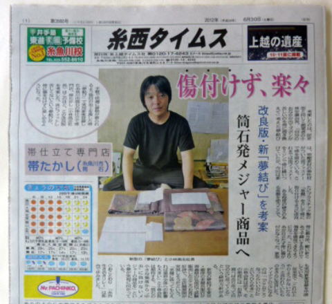 ◆ただし、手縫いだと強度が保つことが難しく、力のかかる部分をよく補強しないとすぐに取れてしまう危険があります。ですが、当店の夢結びは、幸いにも弾性材のクッションがあるために力を分散できますのでこれが可能でした。弾性材使用は、(株)帯たかしの新案特許ですので、このタイプのワンタッチ帯で手縫いなのは、新夢結び加工だけになっております。